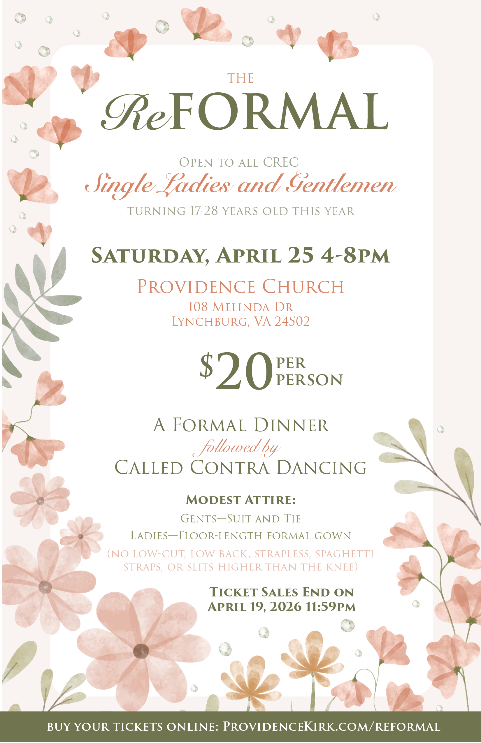 Providence Church invites all surrounding CREC churches single ladies and gentlemen turning 17-28 years old this year to join us at our 2nd Annual ReFORMAL dinner and dance. This is your opportunity to dress fancy, indulge in a gourmet dining experience, and meet like-minded individuals in an elegant and welcoming atmosphere.